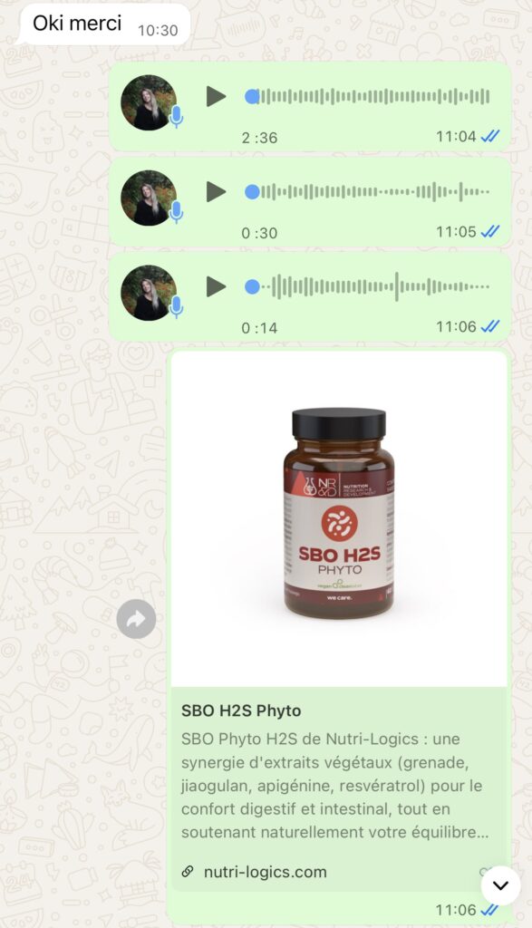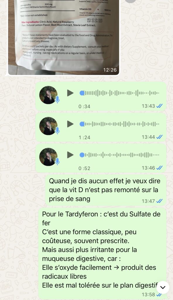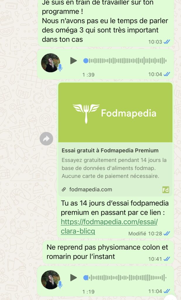 Quand cela me semble pertinent, je partage aussi des outils complémentaires (podcasts, livres, applications…) pour t’aider à mieux comprendre et avancer. J’utilise beaucoup les vocaux pour bien détailler mes propos.